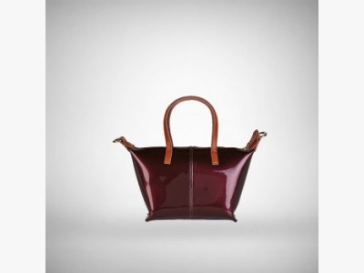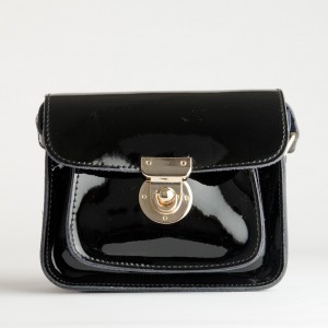 Patent leather bag. Closes with a flap and a twist catch. Long adjustable handle.