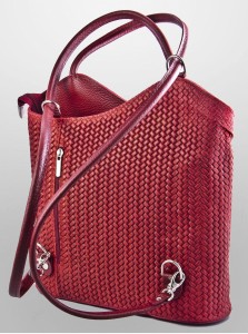 Italian woven leather shoulder bag that easily transforms into a backpack. There is a zip closure at the top with a zipped pocket on the front and back. Inside the bag there are three more pockets, a side zipped pocket, a mobile phone pocket and a central zipped pocket which divides the interior of the bag into two. To transform the bag into a backpack you need to pull the handles together on the reverse side of the bag where the handles have clips on the bottom (click on red or blue colour to see images of the backpack).