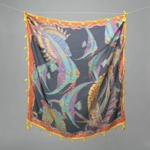 100% Silk Square. Multi coloured fish on a navy background with an orange boarder and yellow tassels.